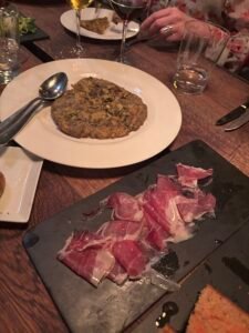Our Dinner Club visit in March on the first (hopefully of many to come) dry and springlike evening we have experienced in London for a long few months too us to País Vasco inspired Sagardi. Just a short walk from bustling Liverpool Street into the trendy streets of Shoreditch we were promised both Basque Country atmosphere and flavours. The restaurant’s creators pride themselves on delivering an authentic Basque experience and as we entered the restaurant those of us who had spent time in the Basque Country definitely sensed a familiarity, and as we meandered through the forest of solid wooden tables and chairs to reach our table passing our main course, two huge Txuleton steaks resting on wooden chopping boards and destined for the bbq, we were confident in the promise of bold flavour and Basque quality.