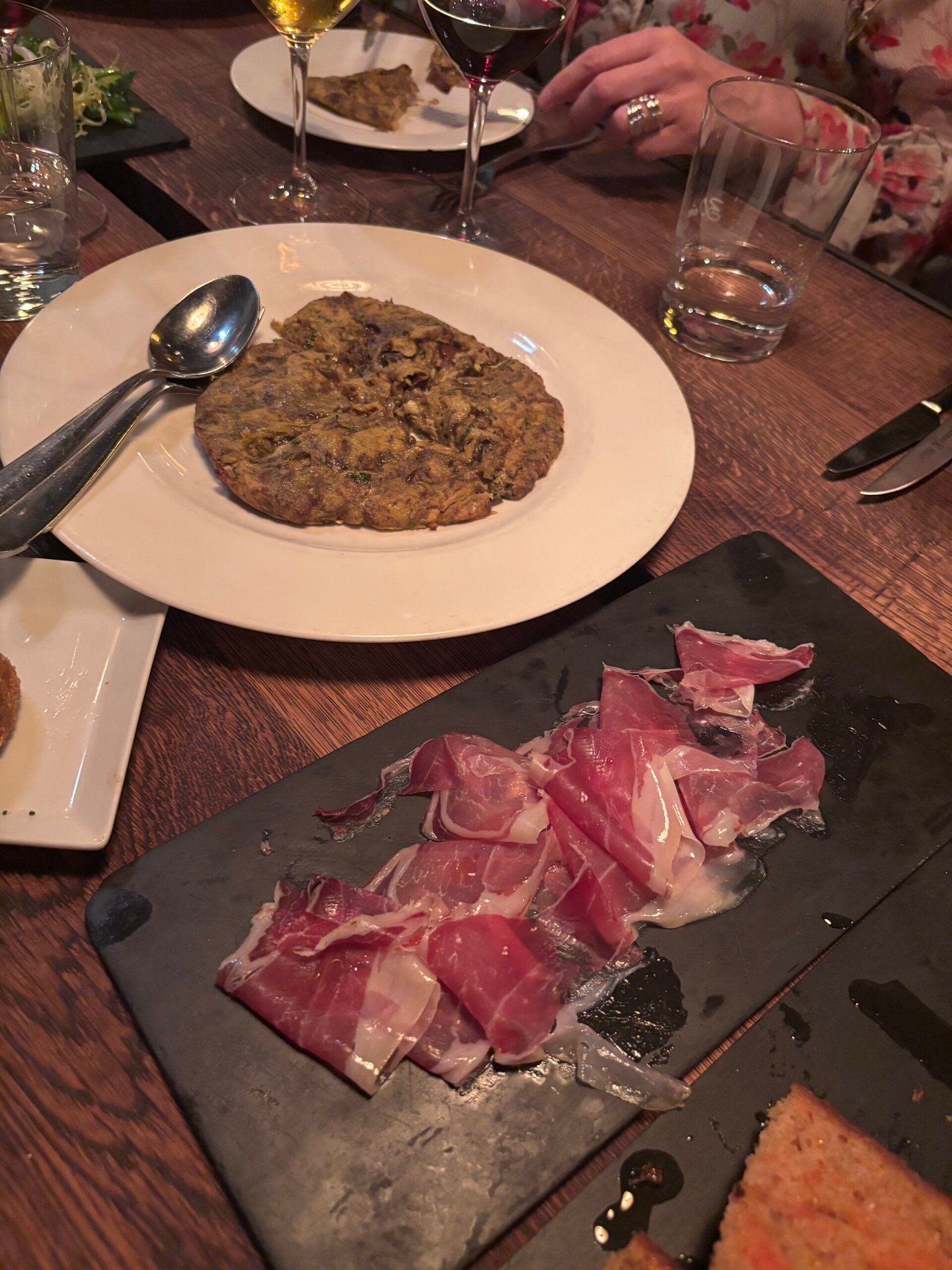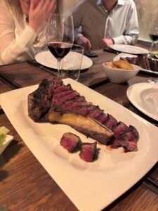 After a brief welcome from the events team our starters arrived, a delicious selection of finely sliced jamón, croquetas bulging with creamy mushrooms, codfish tortilla, paté and juicy pan con tomate. Members then had time to chat and await the main course, the still enormous Txuleton steaks served with lettuce and crispy potatoes.