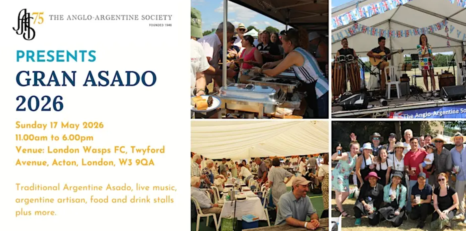 Tickets are now on sale for the Anglo-Argentine Society's Gran Asado Argentino on 17 May. Details below: